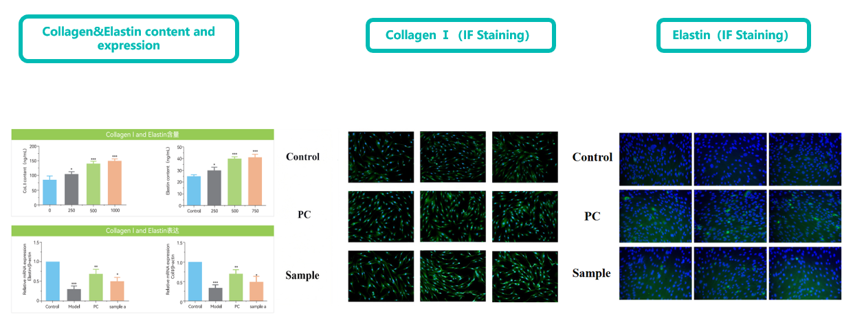 Primary fibroblast aging model | Type I collagen and elastin content | |
