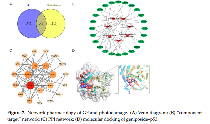 蛋白質組學與網絡藥理學結合:通過DIA定量蛋白組技術發現G2/M檢查點等梔子抗光損傷關鍵靶標;運用網絡藥理學分析鎖定TP53/IL1B/MMP9等核心靶點;創建梔子苷-p53分子對接驗證,為梔子提取物抗光損傷機制研究提供多組學交叉驗證范式。