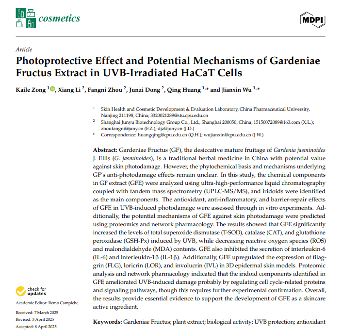 SCI期刊最新發表:瑞旭科新生物與君裕集團合作揭示梔子提取物抗皮膚光損傷科學機制