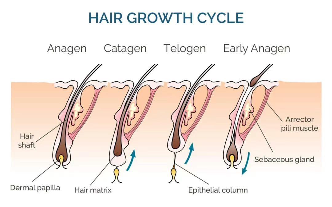 哺乳動物毛發的生長和脫落呈周期性變化,經歷生長期、退行期、休止期再向生長期轉變進入新的生長循環,與其他哺乳動物不同,人類各個毛囊的生長和毛干脫落不是同步的,健康頭發的90%以上的毛囊處于生長期,持續4-7年,退行期為2-3周,休止期約為幾個月,休止期毛囊的毛干受輕微牽拉就會自然脫落。頭皮上的毛發每天長約0.3~0.4毫米,生長期時間決定毛干總長度,身體其他部位毛囊的生長周期比頭皮毛囊的要短得多,僅有4-7個月不等,因此體毛比頭發短得多。頭發的生長期毛囊比例變少,將導致毛發密度降低,表現為脫發。